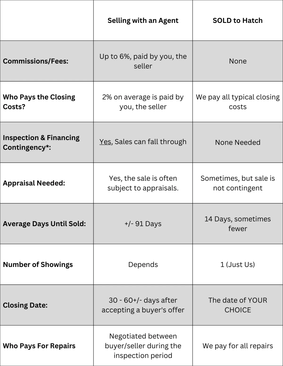 Great question. Here at Hatch, we are professional home buyers: We buy houses that meet our purchasing criteria, and we don’t use traditional bank financing so you don’t have to worry about our ability to close on a deal. After purchasing, we may repair the house and resell it to another homeowner or keep it as a rental ourselves.
